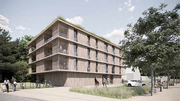 Das Bauwerk in Holzhybridbauweise bekommt einen Betonkern und Holzfassaden. Im EG werden Friedhofsverwaltung und Bestattungsdienst untergebracht, darüber entstehen zwölf ´bezahlbare Wohnungen´ unterschiedlicher Größe (ca. 12 €/QM), das Dach soll als Garten gestaltet werden, als ´Erholungsfläche mit Spielplatz und Hochbeeten´.
